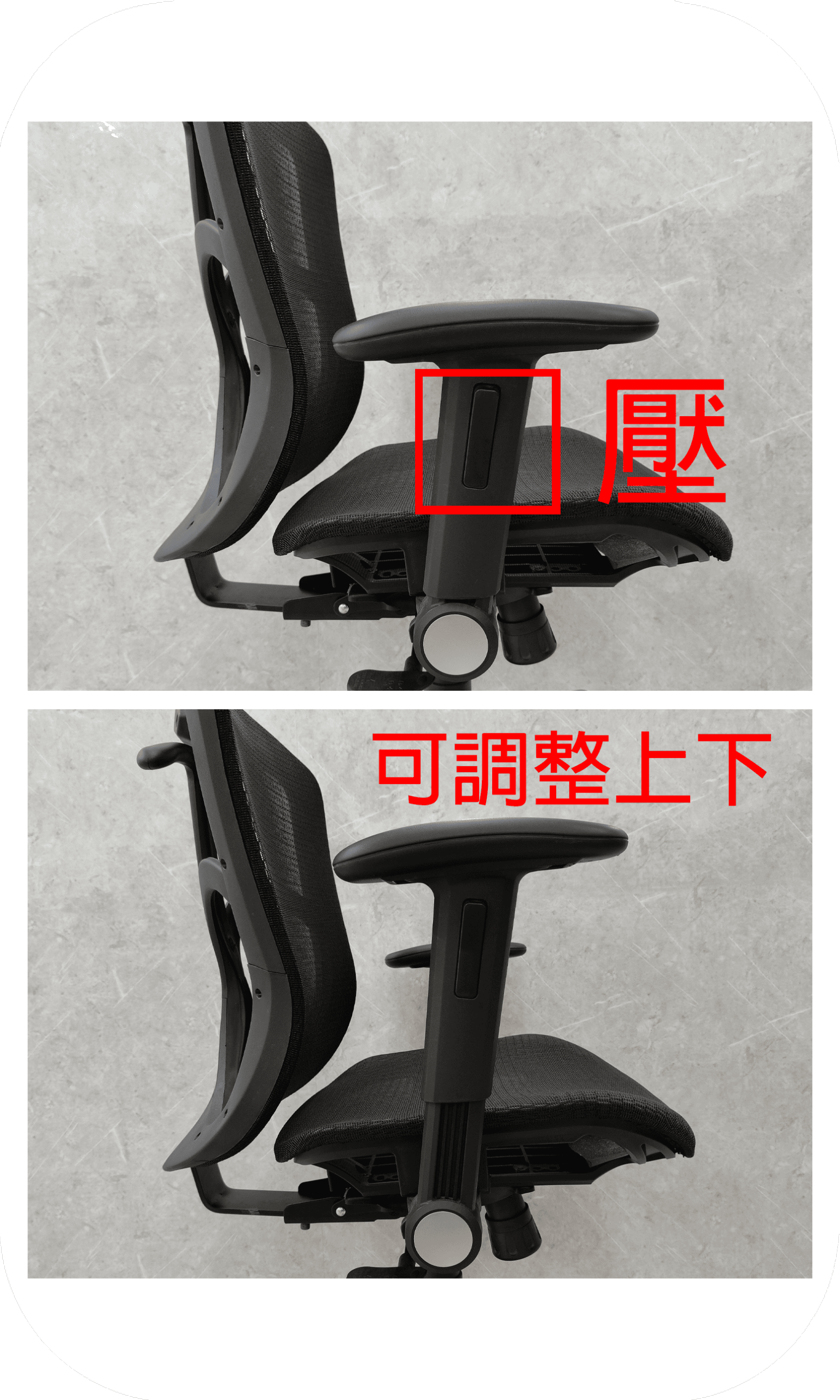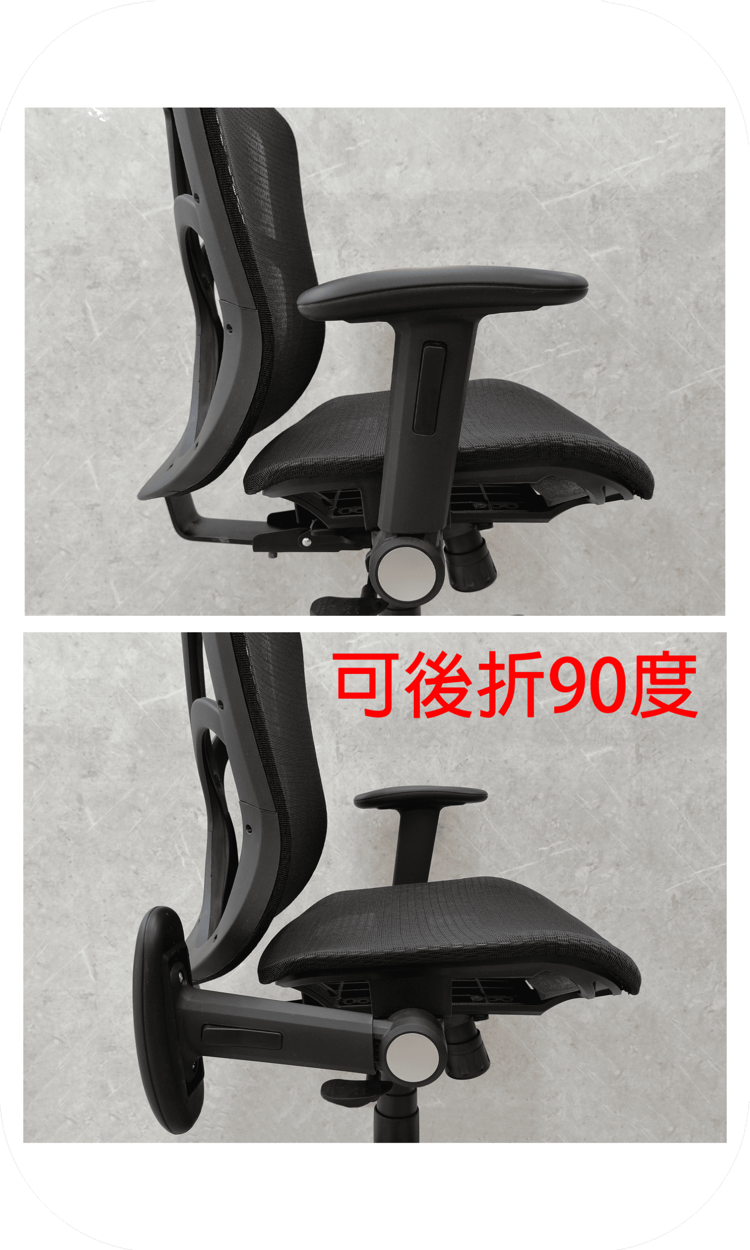 扶手可高低六段升降,可後折90度,更節省空間區域。